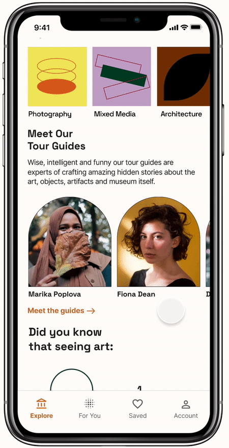 The For You space invites you to create a museum experience that’s uniquely yours. Curate your interests with ease, and connect with guides who enhance your visit by sharing hidden stories—about the artwork, the artist, and the creative process. With personalized guide recommendations and in-depth filters, each discovery feels tailored, making your museum visit truly memorable.