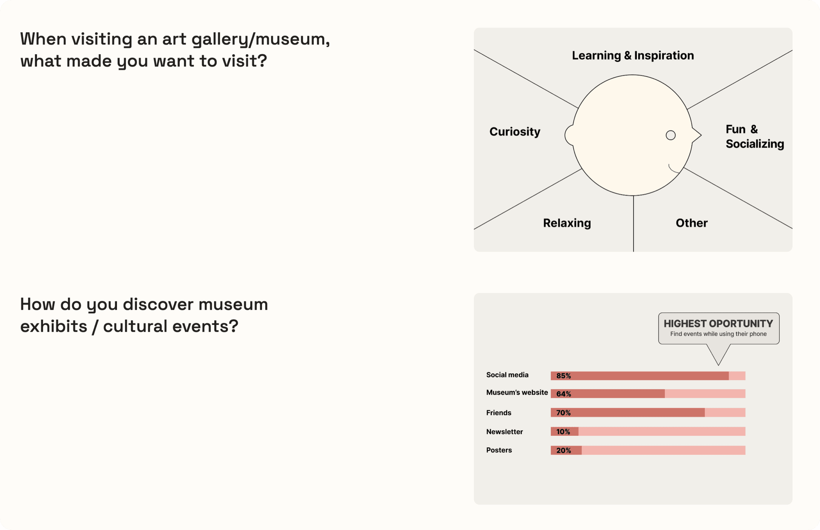 Through 1-on-1 interviews and surveys, I identified a critical gap: most users struggle to find museum exhibitions that cater to their interests. In the post-COVID landscape, participants highlighted the need for convenience, streamlined information, and a safe visiting experience, indicating a clear direction for improvements.