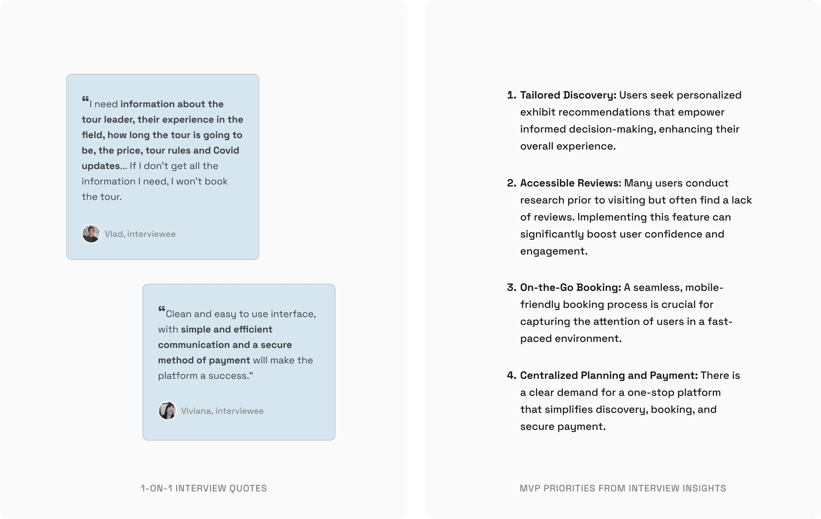 To validate these observations, I conducted user interviews and surveys. I discovered that 80% of users preferred in-person tours, and 75% were more likely to book if they knew about the guide in advance. This confirmed the value of integrating guide profiles and personalized recommendations into Boki.