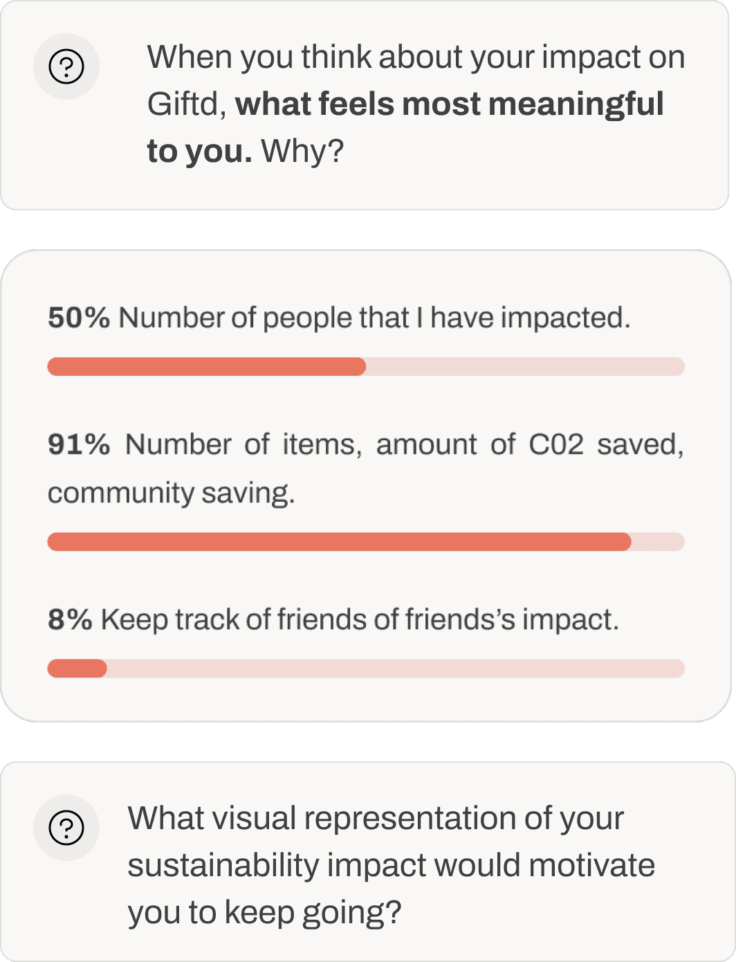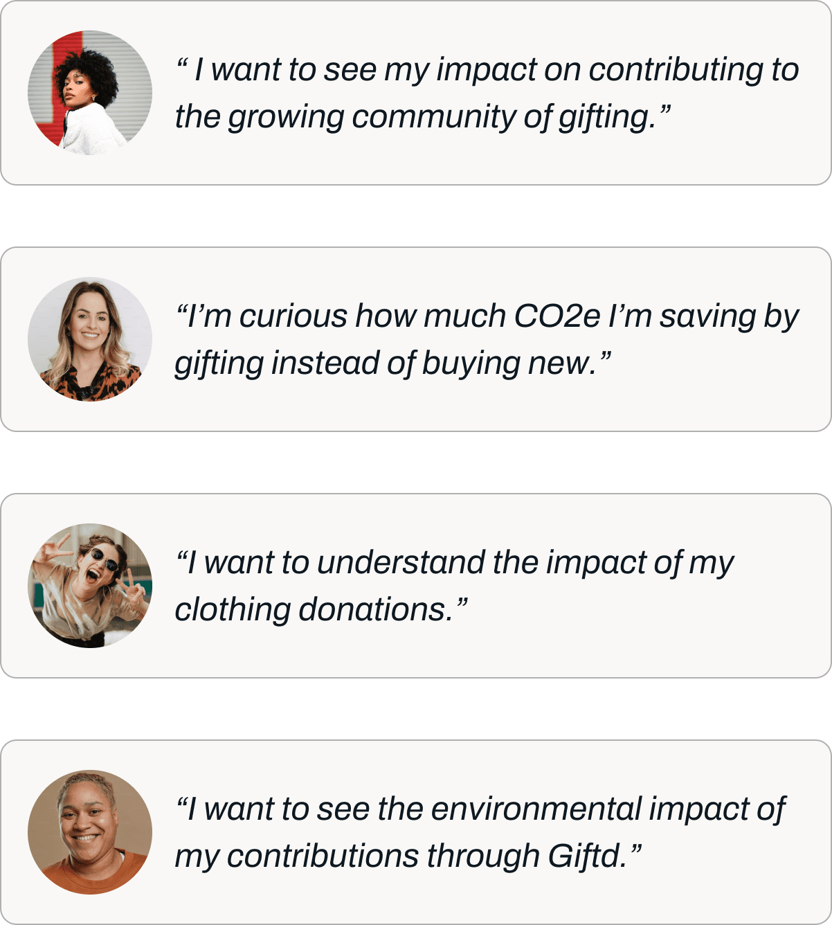 While Giftd's mission is to foster eco-friendly practices, users lacked a clear way to see the tangible impact of their contributions, such as CO2e savings from their clothing giveaways. This gap affected user engagement, as it limited their motivation to participate and share the app with others. By making these impacts visible, we sought to enhance user satisfaction and drive increased participation, ultimately supporting Giftd's growth objectives.