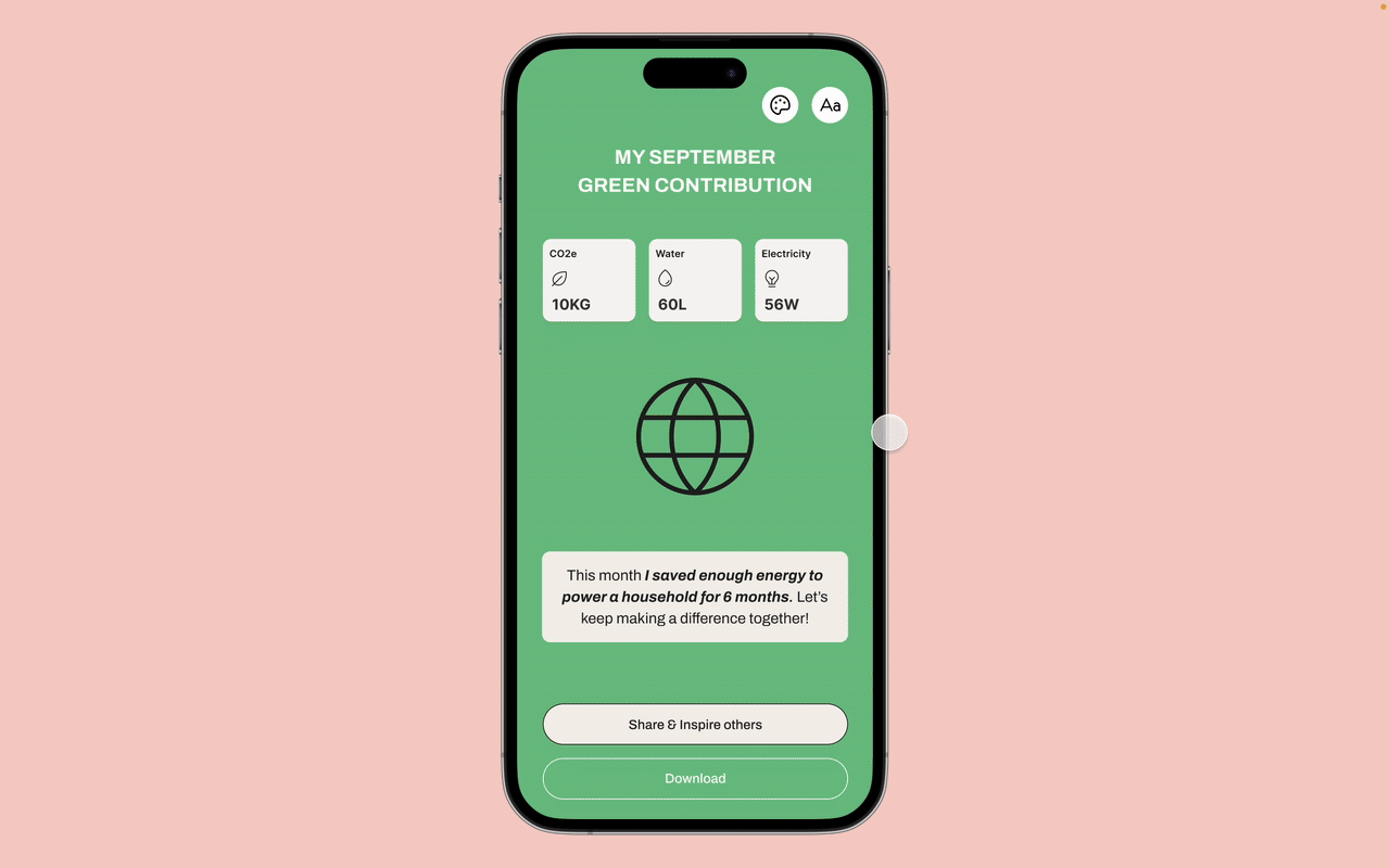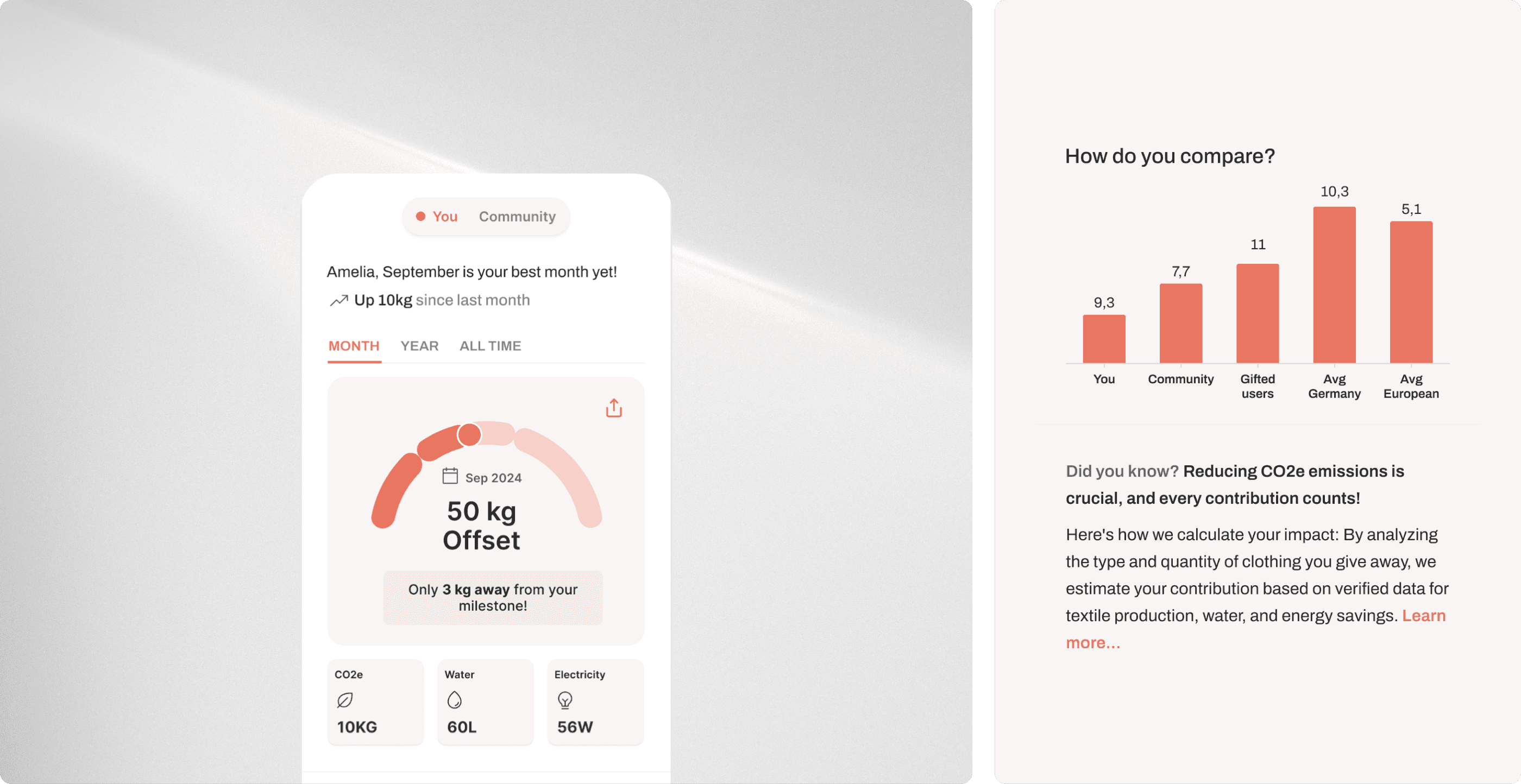 The clear visualization of CO2 offset, water, and electricity savings creates a deeper, educational connection to their actions. Users now feel motivated by both their individual achievements and how they support the collective, driving further engagement and loyalty to the platform.