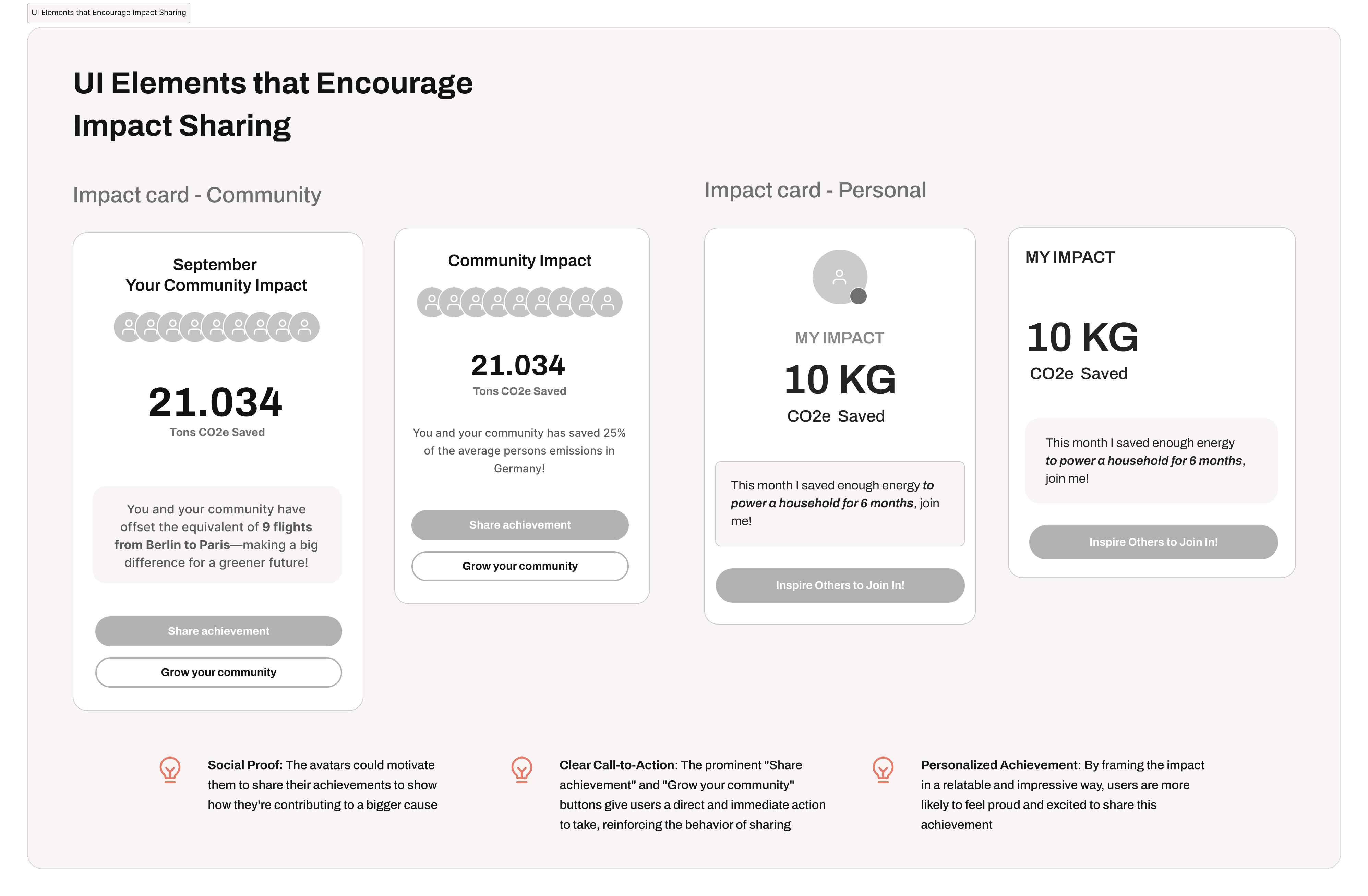 During ideation, I explored how to make sharing environmental impact more engaging. I designed three key elements: