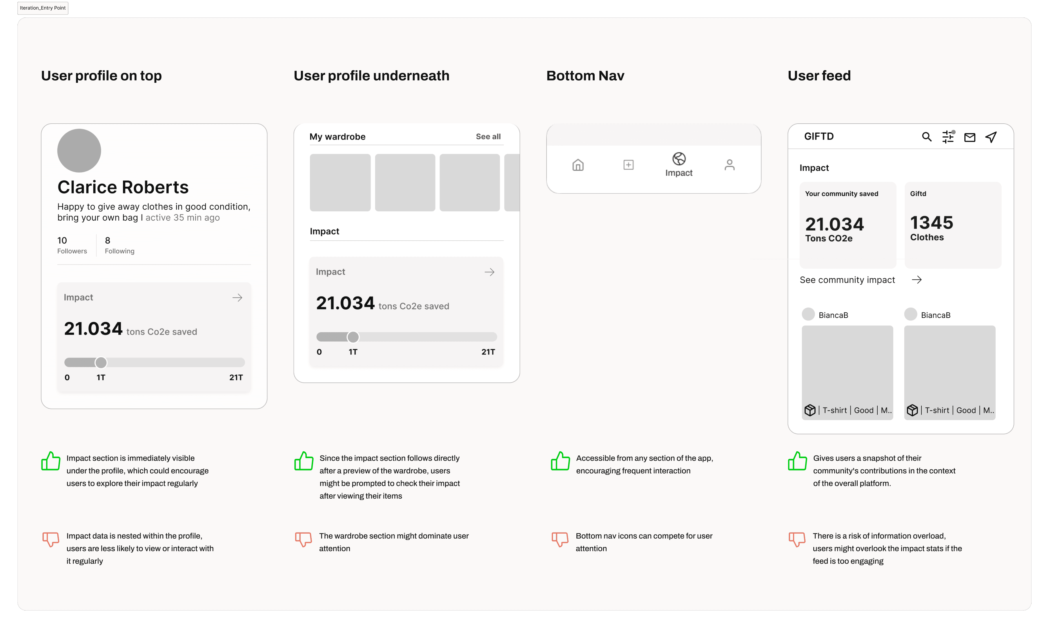 Through interviews and early sketches with Giftd ambassadors, we discovered that users found CO2e savings too abstract. They wanted a clearer understanding of how their clothing donations impacted the environment. This led us to broaden our approach, exploring the full scope of their contributions—focusing on the environmental impact of clothes and fabrics.