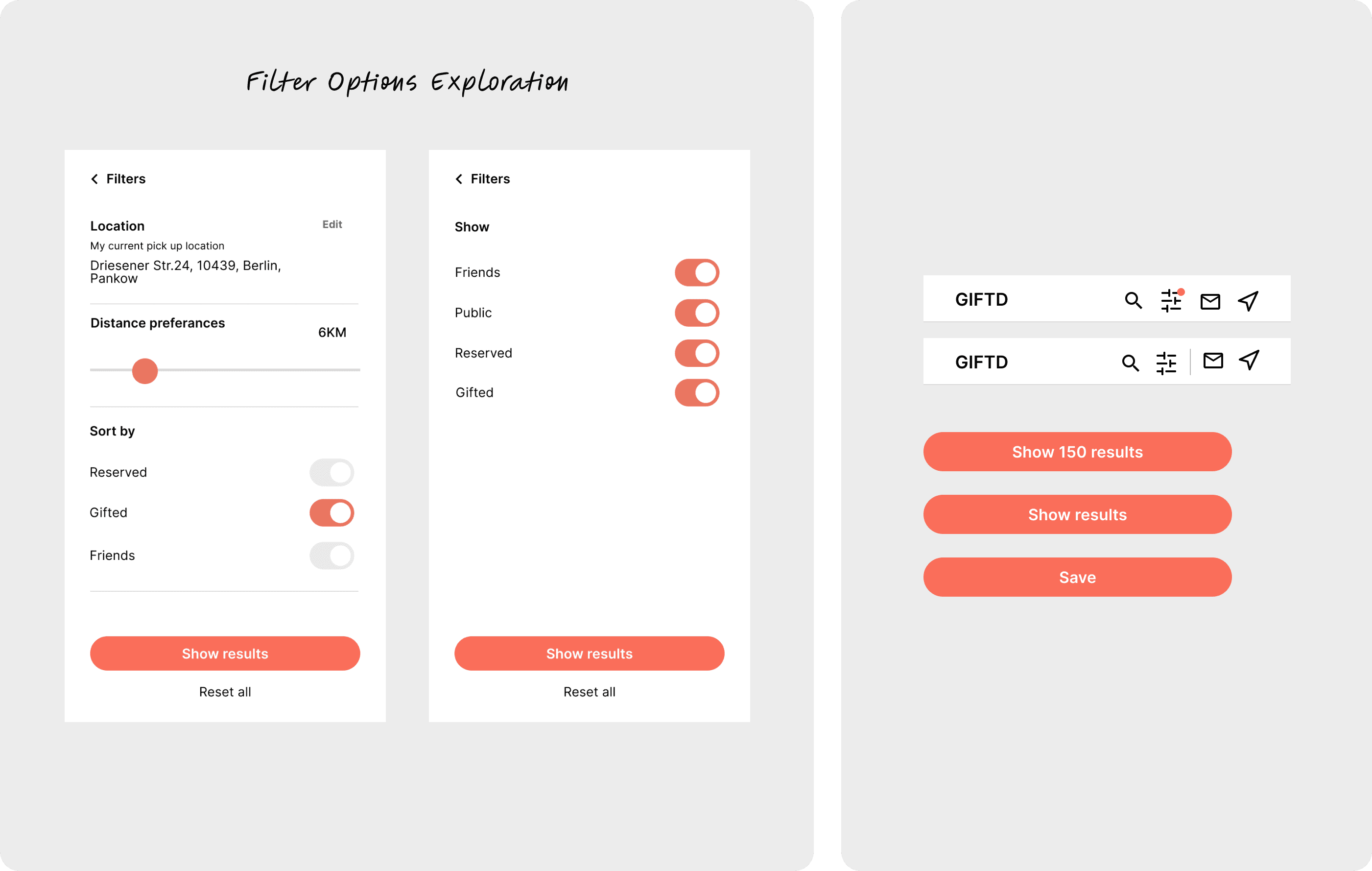 Recognizing the business need to improve discoverability and retain user engagement, I collaborated with the founder and developer to design and implement the app’s first filtering options. We prioritized filters by friends, reserved items, public listings, and gifted items—aiming to make browsing simpler and more tailored.