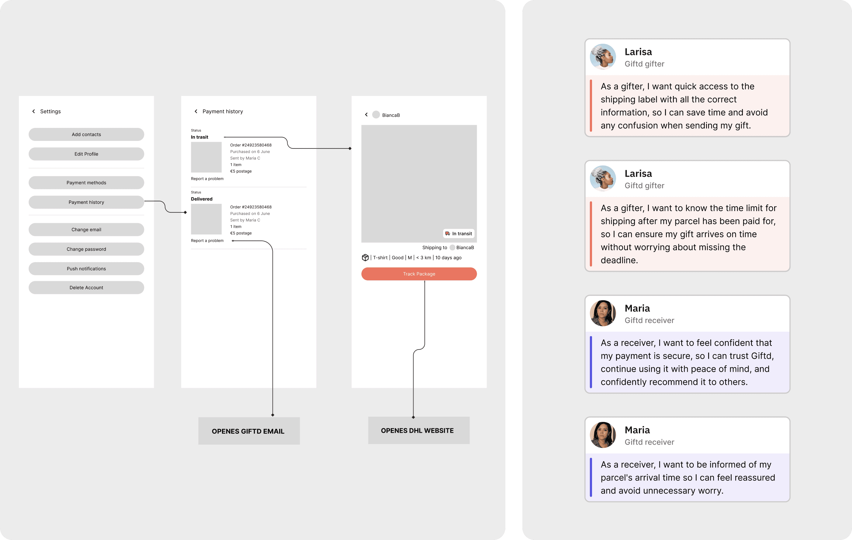 In designing the delivery feature, I focused on building trust in the payment process and creating a clear, user-centered flow. By developing user stories for both gifters and receivers, I ensured that each step addressed their key goals, such as having quick access to shipping labels, understanding delivery timelines, and feeling secure with payment.