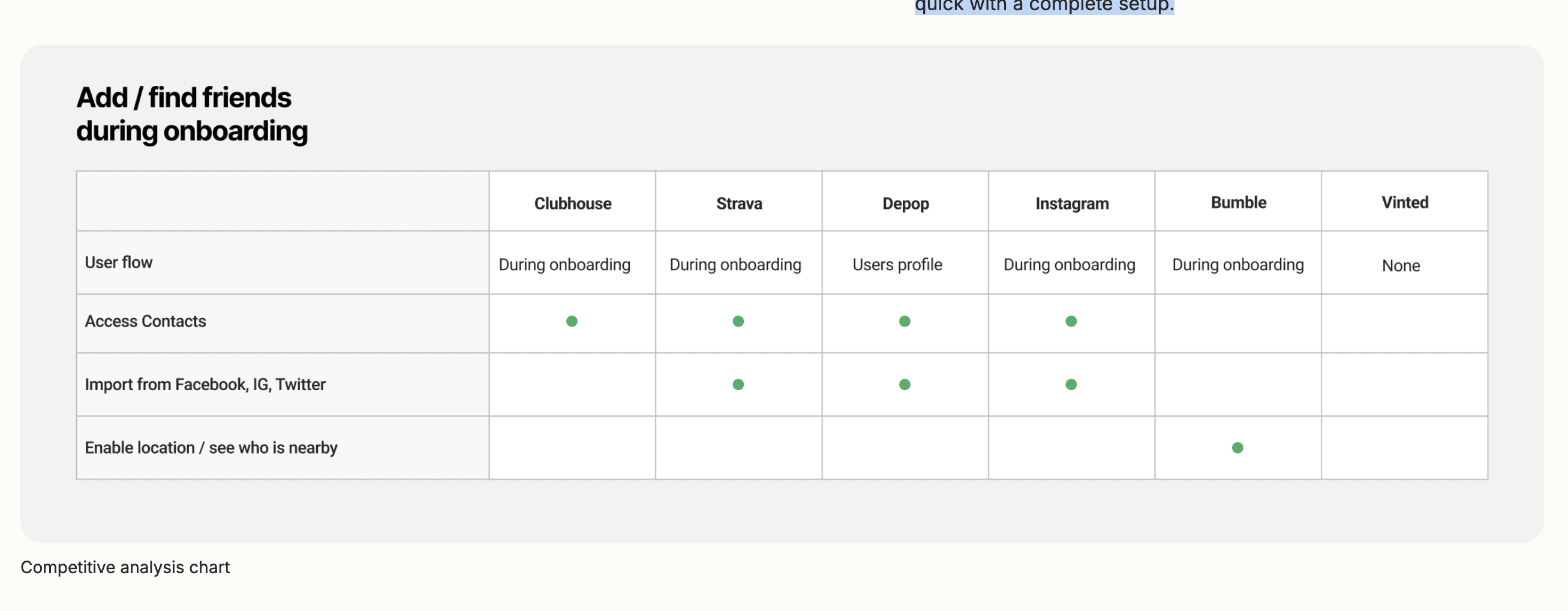 With our goals clearly defined, I conducted a competitive analysis to explore how other apps incorporate social connections during onboarding. Key insights from apps like Clubhouse and Instagram showed the importance of connecting users with their contacts early. This guided our decision to prioritize a 'connect with friends' feature for Giftd's onboarding flow.